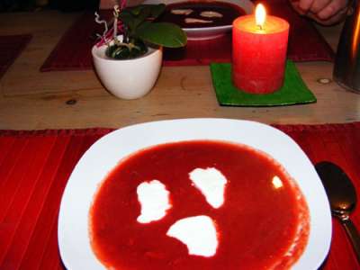 Den Sauerrahm glatt rühren und die Suppe damit vor dem Servieren dekorieren.